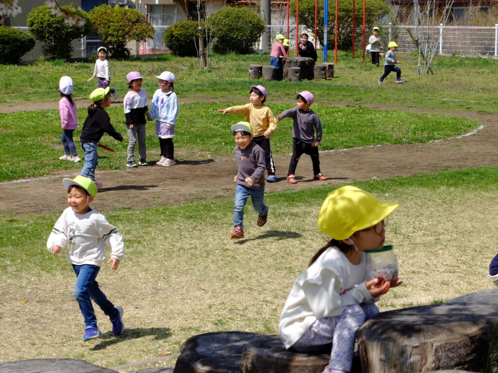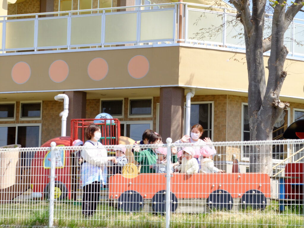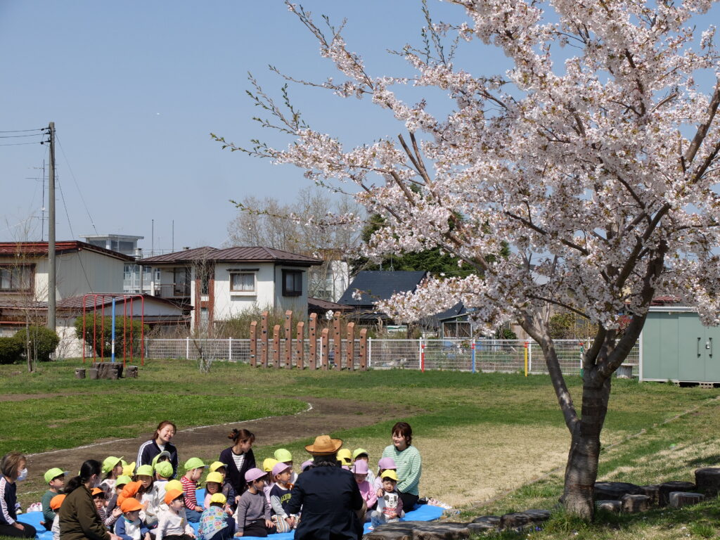 すみれ保育園の桜も満開となり、今日は穏やかな風がふく絶好のお花見日和。お友だちみんなで桜を見上げながら、歌を歌ったり、手遊びをして楽しく「春」を味わいます。来年も元気な桜がたくさん咲くといいですね。